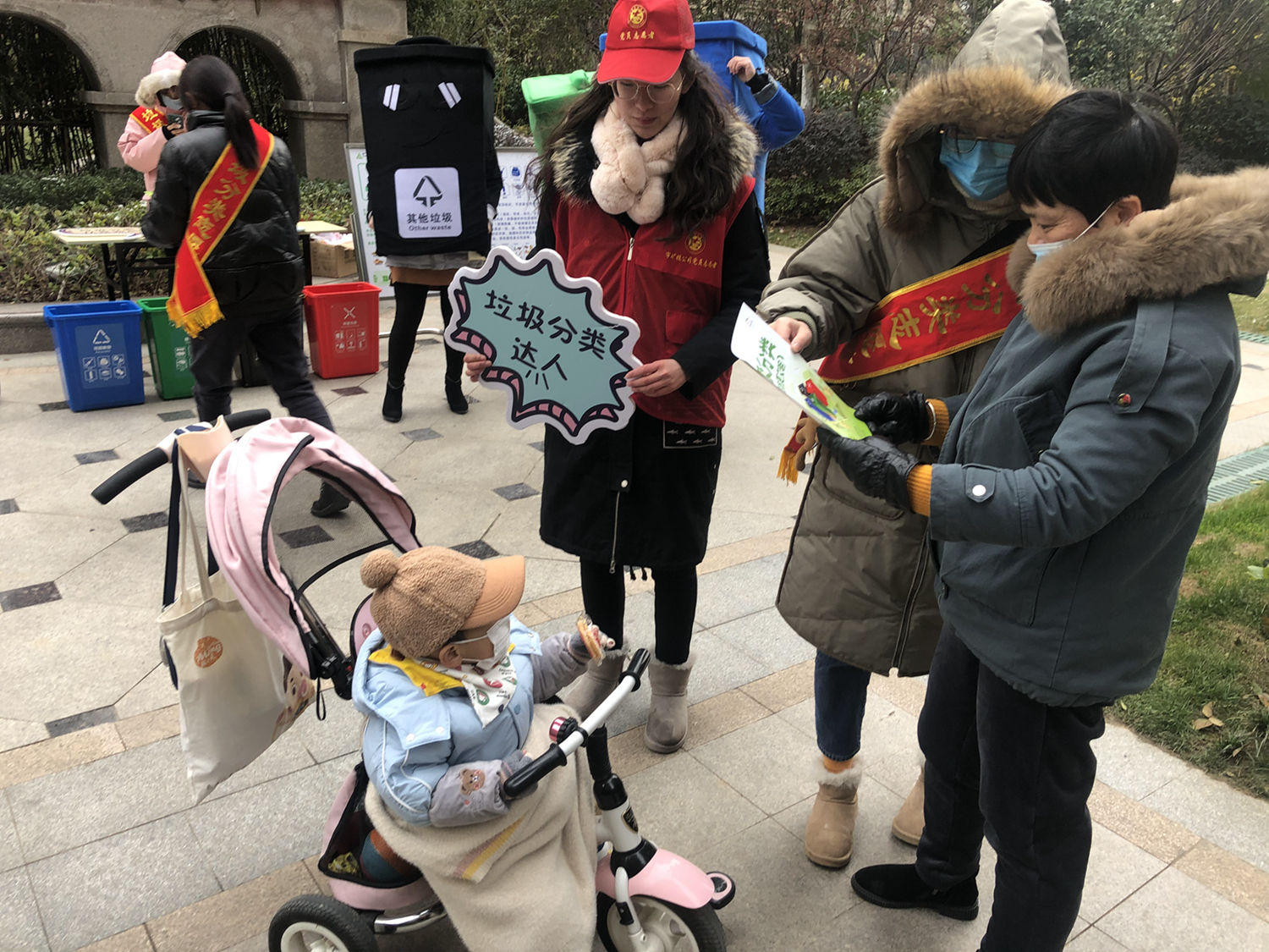 活動中,志愿者們身穿“可回收物”、“廚余垃圾”、“有害垃圾”、“其他垃圾”四色玩偶服,通過向居民發(fā)放宣傳單頁、開展“垃圾分分樂”、“垃圾分類跳棋”游戲等方式,向其宣傳垃圾分類相關(guān)知識。活動現(xiàn)場氣氛火熱,社區(qū)居民不畏嚴(yán)寒,紛紛從家中拿出廢舊電池、舊水銀溫度計等有害垃圾換取垃圾袋。