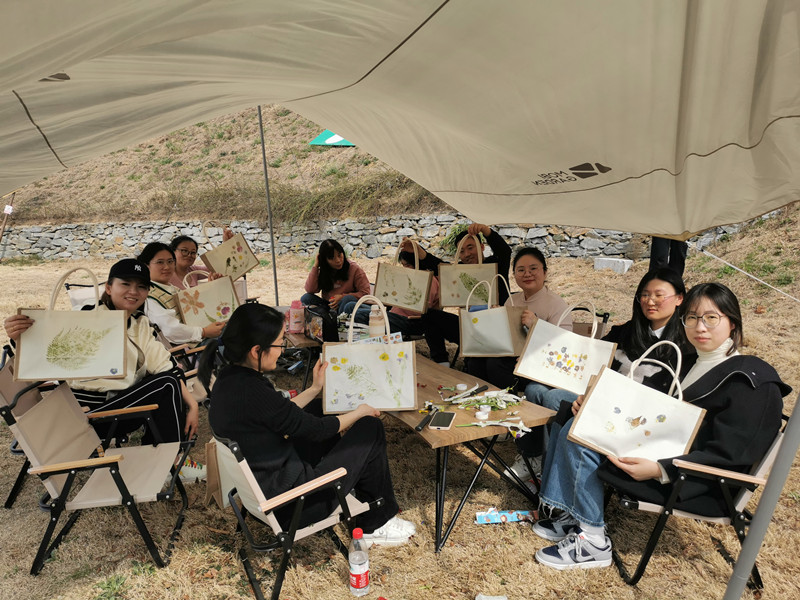 三月春意盎然,大家在指定區(qū)域采集新鮮植物,并通過自己的設(shè)計將植物拓染在帆布包上,留下了春天的印記,把春色“袋”回家。