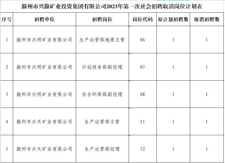 根據(jù)《滁州市興滁礦業(yè)投資集團有限公司2023年第一次社會招聘公告》規(guī)定,經(jīng)對各崗位報名情況篩查審定,部分崗位報名情況未達到開考比例,經(jīng)研究決定取消以下崗位招聘計劃: