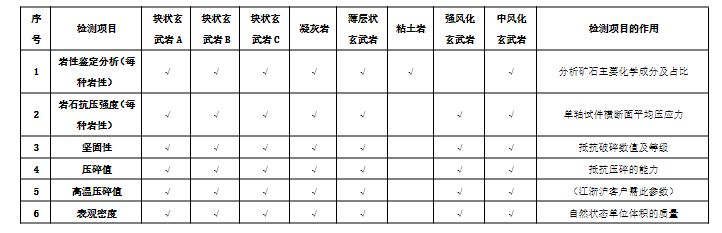 (6)招標(biāo)范圍及內(nèi)容:對(duì)諭興礦礦區(qū)南側(cè)+5m以上8種玄武巖原石檢測(cè)(檢測(cè)項(xiàng)目具體如下表)。檢測(cè)成果需滿(mǎn)足國(guó)家法律法規(guī)、行業(yè)檢測(cè)標(biāo)準(zhǔn),提供技術(shù)咨詢(xún)服務(wù)與集料破碎。